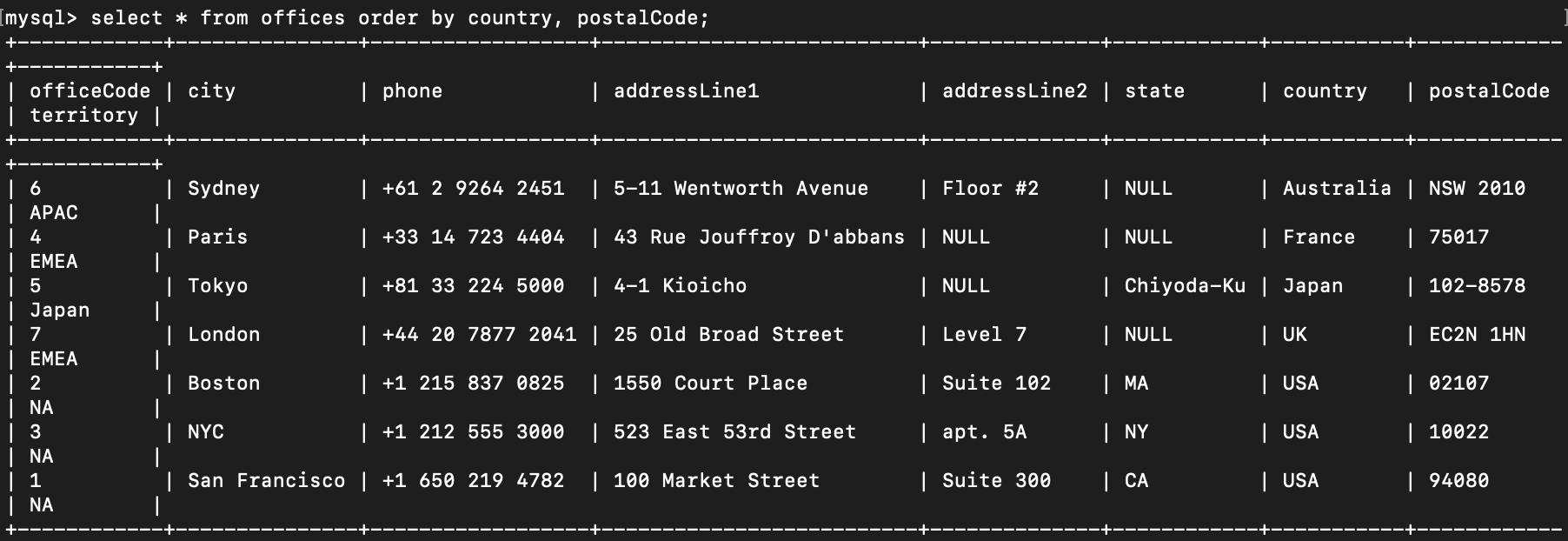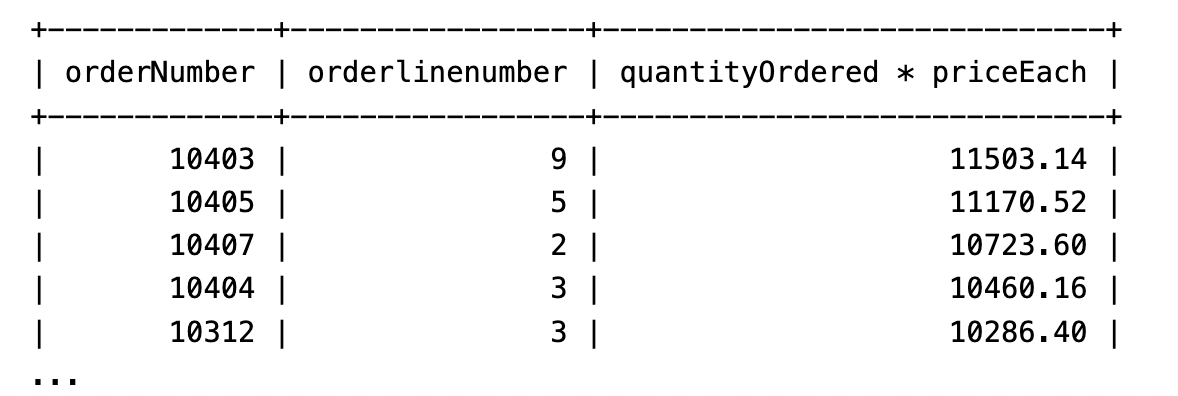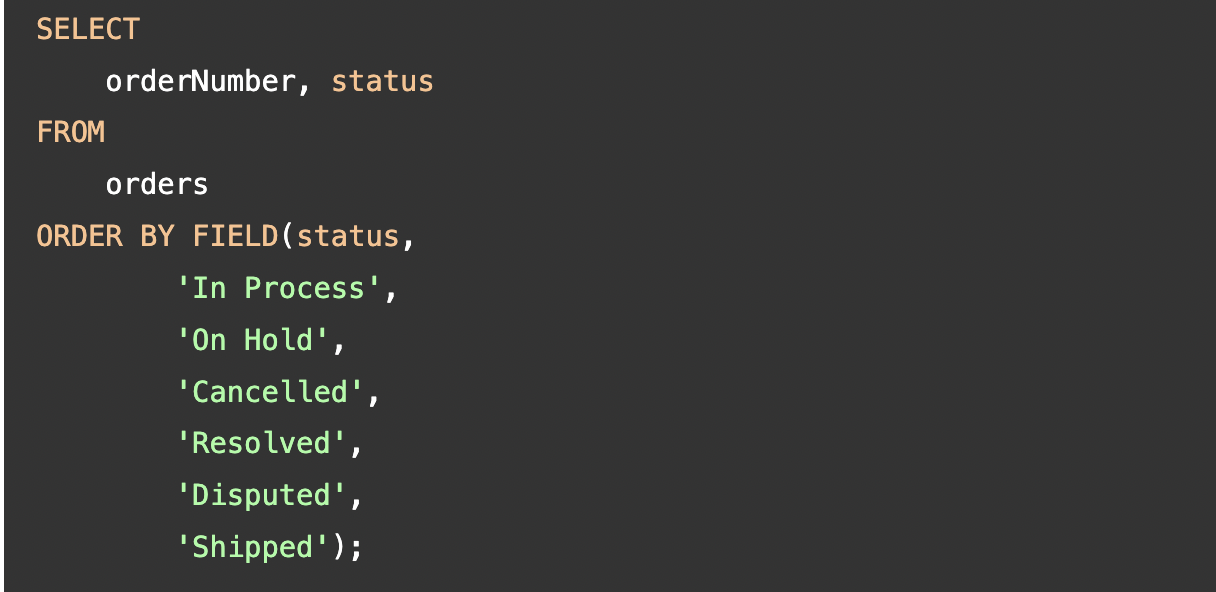 [기본] SELECT select_list FROM table_name ORDER BY column1 [ASC|DESC], column2 [ASC|DESC], ...; [예제 1] SELECT * FROM table_name ORDER BY country, postalCode; [예제 2] SELECT orderNumber, orderlinenumber, quantityOrdered * priceEach FROM orderdetails ORDER BY quantityOrdered * priceEach DESC; [예제 2 개선] SELECT orderNumber, orderlinenumber, quantityOrdered * priceEach AS subtotal FROM orderdetails ORDER BY subtotal DESC; [FIELD 문법] FIELD(str, str1, str2, ...) [FIELD 예제 1] SELECT FIELD('A', 'A', 'B','C'); [FIELD 예제 2] SELECT FIELD('B', 'A','B','C'); [심화 예제] SELECT orderNumber, status FROM orders ORDER BY FIELD(status, 'In Process', 'On Hold', 'Cancelled', 'Resolved', 'Disputed', 'Shipped');* 하나 이상의 열(column)로 정렬할 수 있습니다 *