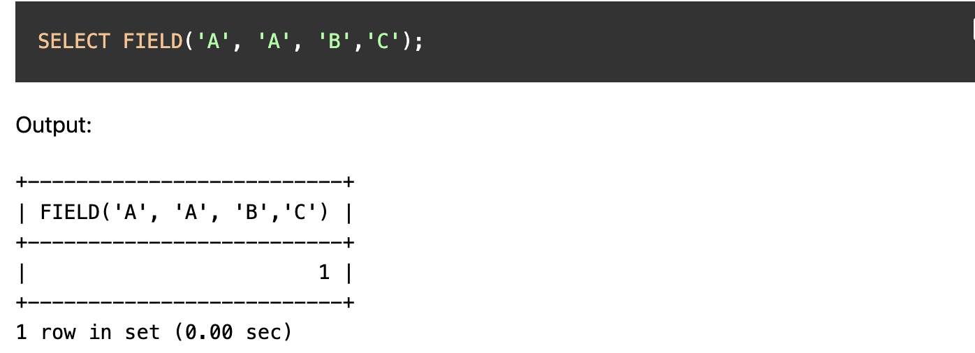 FIELD(str, str1, str2, ...)에서 str을 찾는 문자, str을 제외한 나머지 문자중 str이 몇번째 인덱스에 위치하는지 인덱스를 반환합니다.
